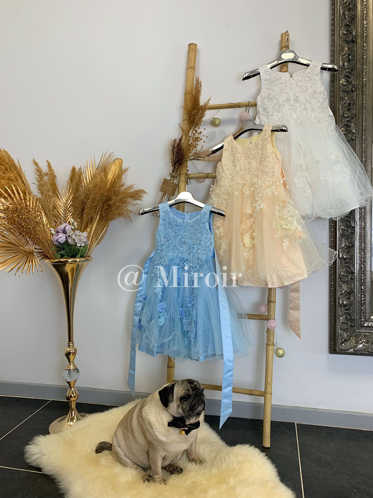 - Couleur : blanc, bleu ciel, dorée beige
